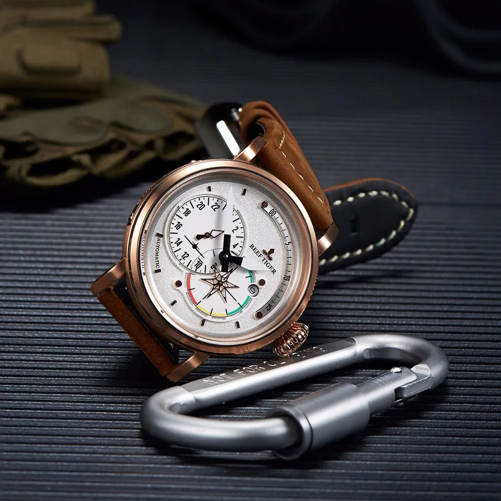Reef Tiger/RT Mens Pilot Watches for Men Rose Gold White Dial Automatic Watch Military Watches with
